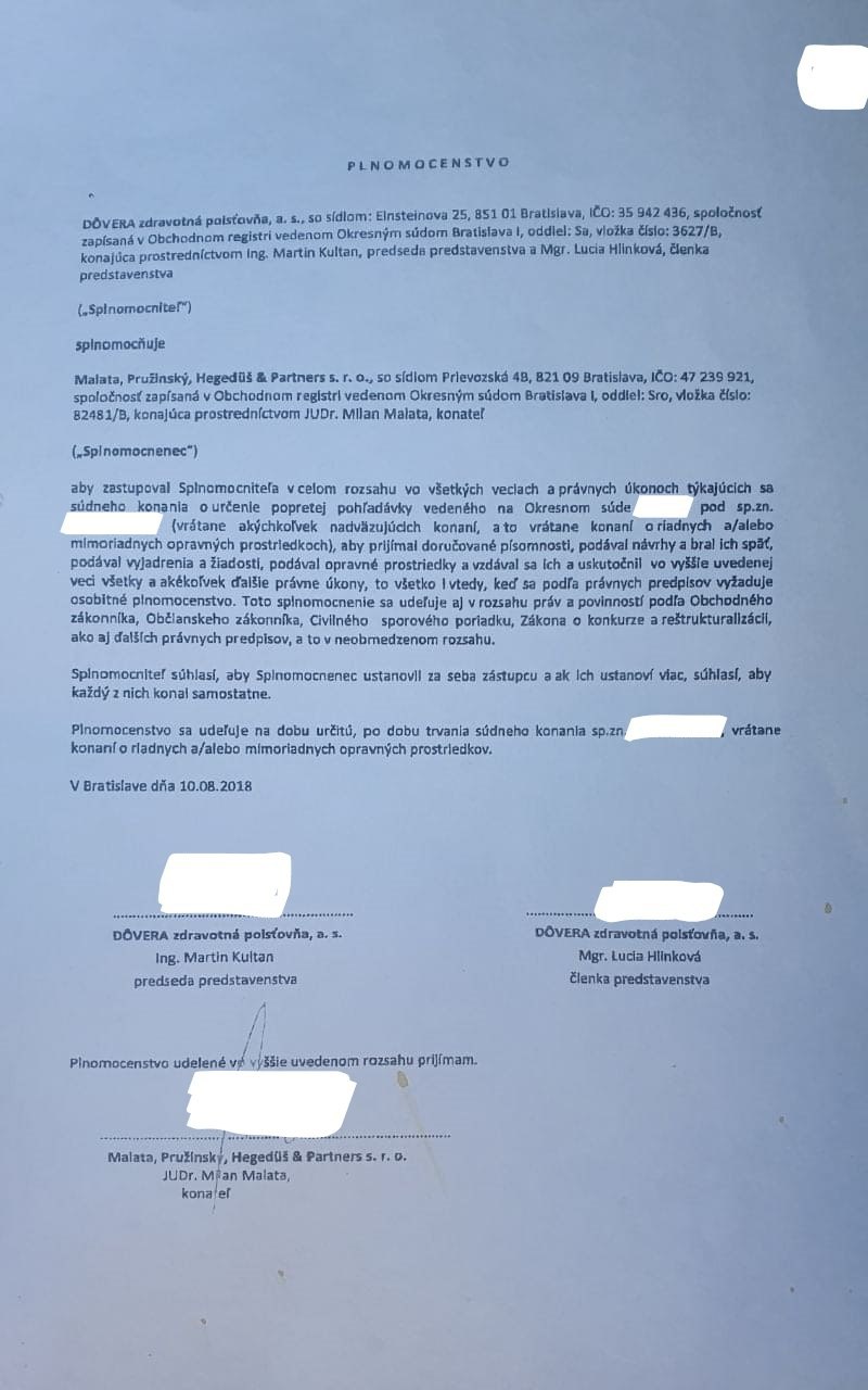 Aký je obchodný vzťah medzi penťáckou zdravotnou poisťovňou Dôvera a advokátskou kanceláriou Malata, Pružinský, Hegedüš & Partners s. r. o., ktorá zastupuje za 1 683 199,- € Slovenskú republiku proti Dôvere?
