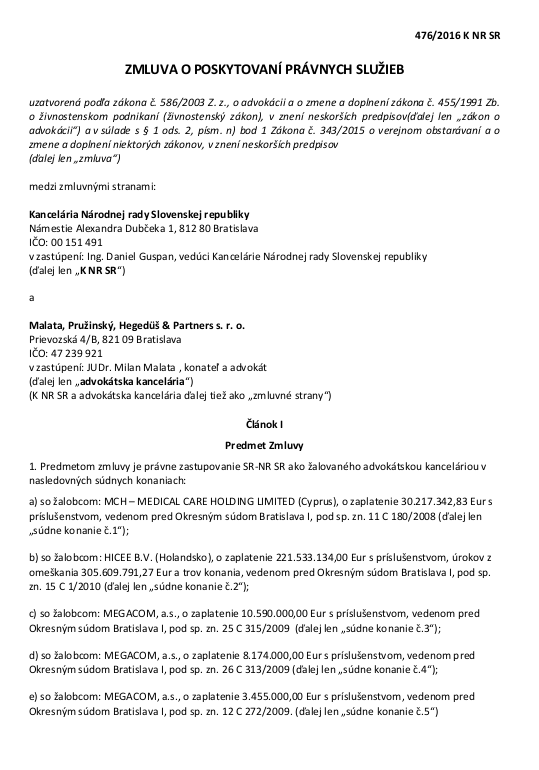 Podľa údajov z Centrálneho registra zmlúv má s Kanceláriou Národnej rady Slovenskej republiky uzatvorenú zmluvu o poskytovaní právnych služieb s NR SR advokátska kancelária Malata, Pružinský, Hegedüš & Partners s. r. o. a Slovensko zatiaľ za právne služby proti vydieraniu zo strany zdravotných poisťovní, zaplatilo 1 683 199,- €!!! Proti takejto sume je odmena pôvodného advokáta JUDr. Jozefa Vozára, CSc., ktorý za služby inkasoval údajne 800,- € mesačne, úplne smiešna.