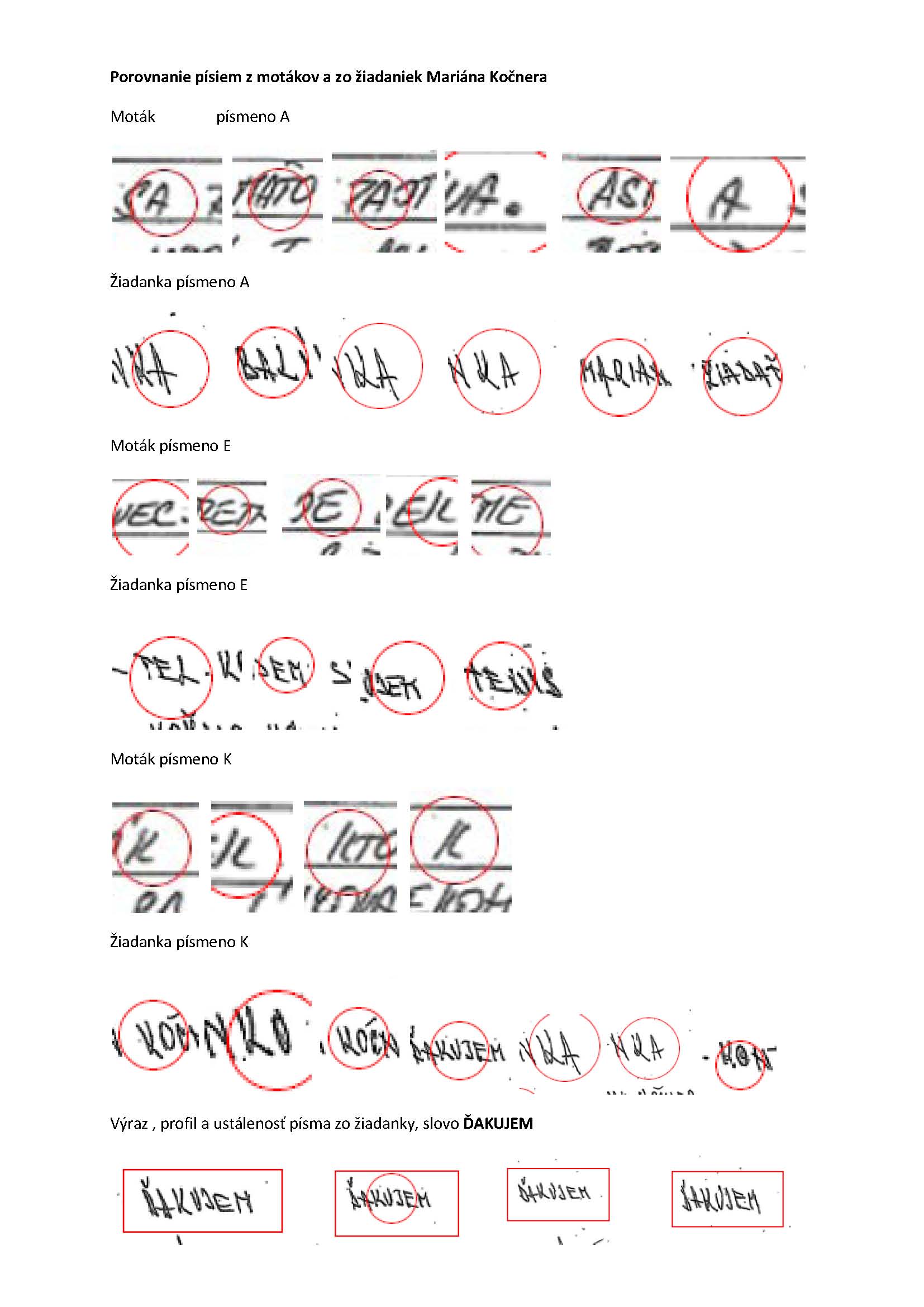 Rozdiely v tvorbe písma vidí aj laik, najmä ostro preškrtnuté A u Kočnera, výrazné K so slučkou a písmeno E tvorené zo samostatných čiar, pričom toto isté písmeno v motáku je tvorené z plynulého L a dopísaním horizontálnych častí. V motáku je písmeno A zjavne oblúkové bez akéhokoľvek preškrtnutia. Ak si uvedomíme, že na žiadankách sa prakticky identicky prekrýva celý profil slova ĎAKUJEM, tak je jasné, že je to vlastný rukopis Mariána Kočnera, ktorý je na hony vzdialený od písma na motákoch.